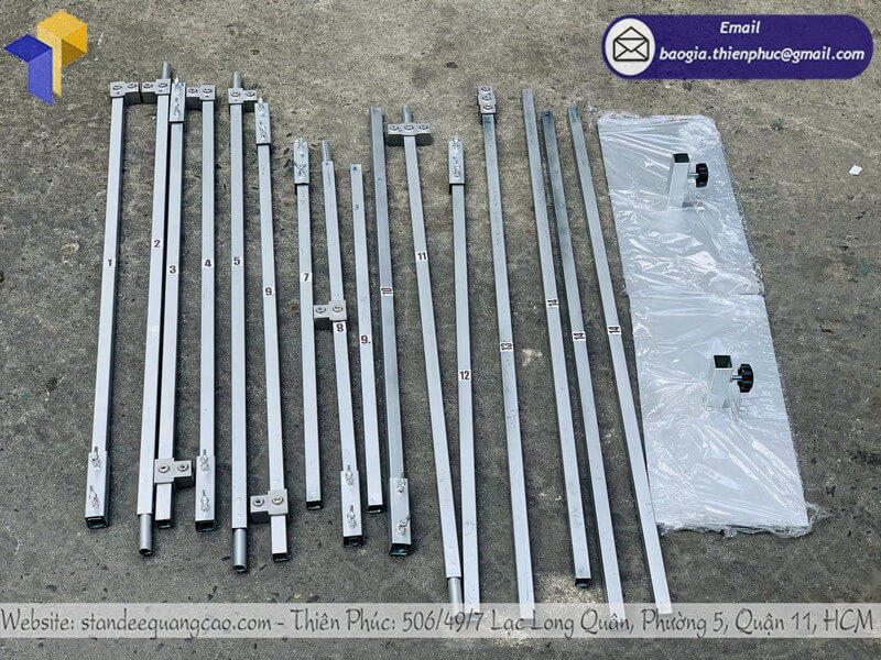Một backdrop di động chuyên nghiệp không chỉ nằm ở phần hình ảnh in ấn mà còn ở cấu trúc tổng thể. Hệ khung được thiết kế theo dạng module, cho phép tháo rời từng bộ phận riêng lẻ, thuận tiện trong quá trình vận chuyển và lưu kho.
