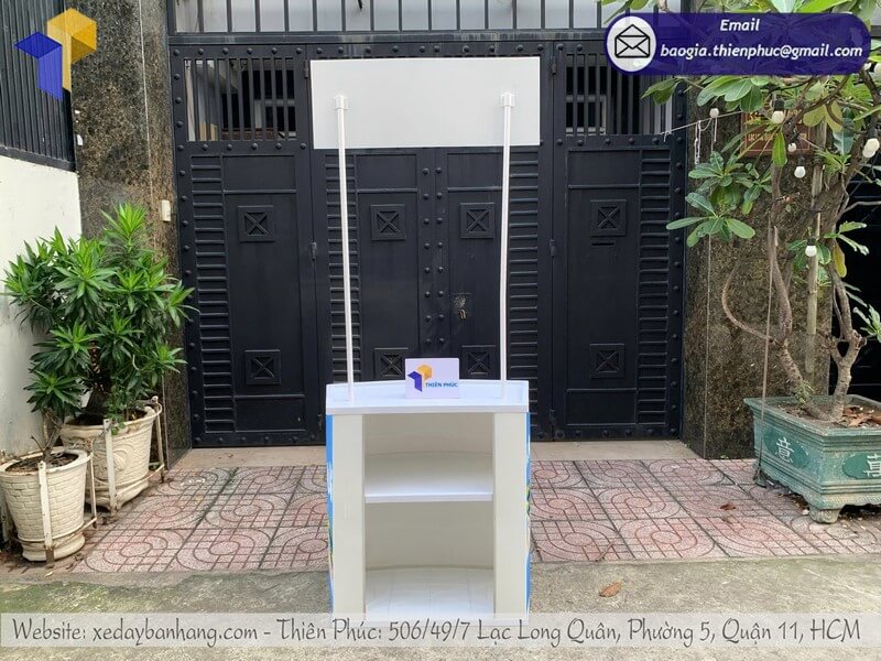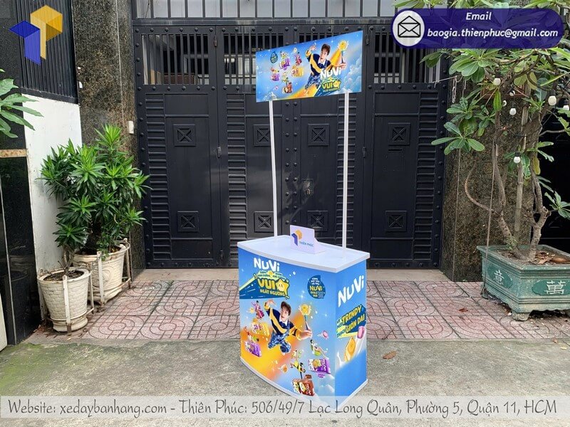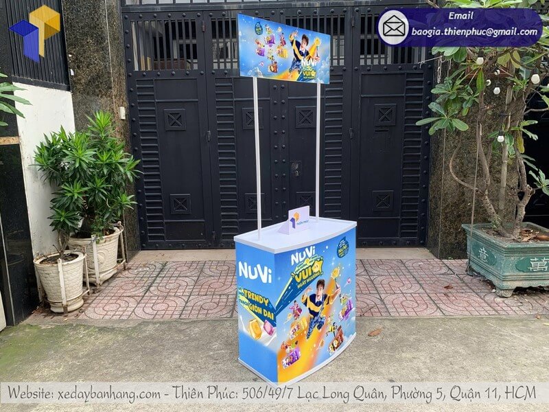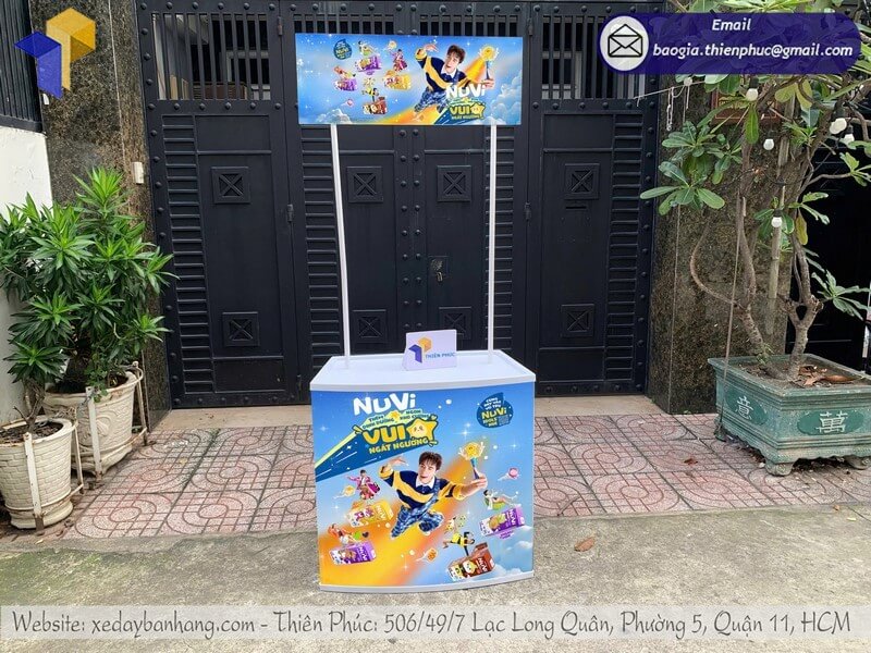 Thứ hai là khả năng trưng bày hiệu quả. Bề mặt booth đủ rộng để đặt sản phẩm mẫu, tờ rơi, vật dụng hỗ trợ bán hàng. Phần mặt trước thường được thiết kế để dán decal nhận diện thương hiệu, giúp tăng độ ghi nhớ trong mắt khách hàng.