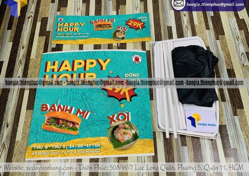 + Phần tấm logo phía trên là 0.3×0.8m chất liệu decal ngoài trời, cắt sát để cán bồi lên bề mặt bàn và tấm logo