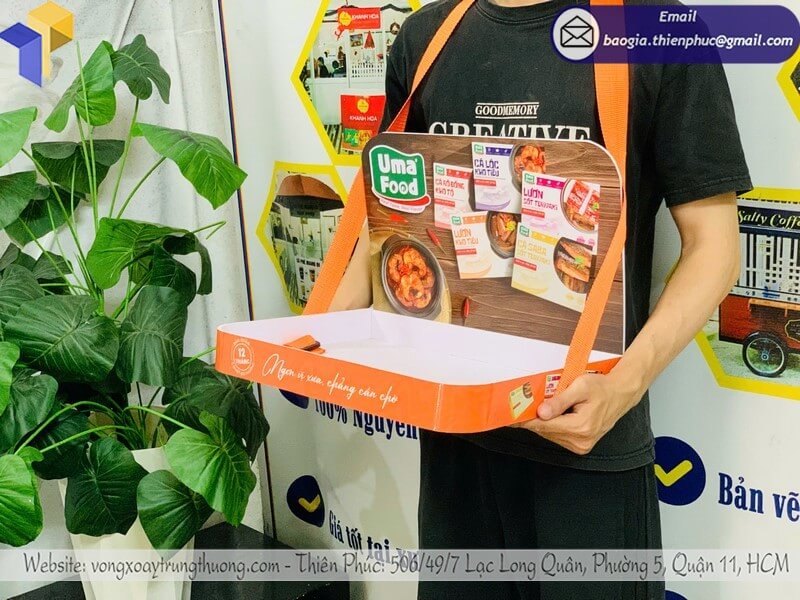 So với việc cầm tay hoặc đặt sản phẩm trên bàn cố định, khay đeo đựng hàng mẫu mang lại nhiều lợi ích vượt trội. Đây cũng là lý do sản phẩm này ngày càng xuất hiện nhiều trong các chương trình quảng bá ngoài trời, siêu thị, trung tâm thương mại hay sự kiện.