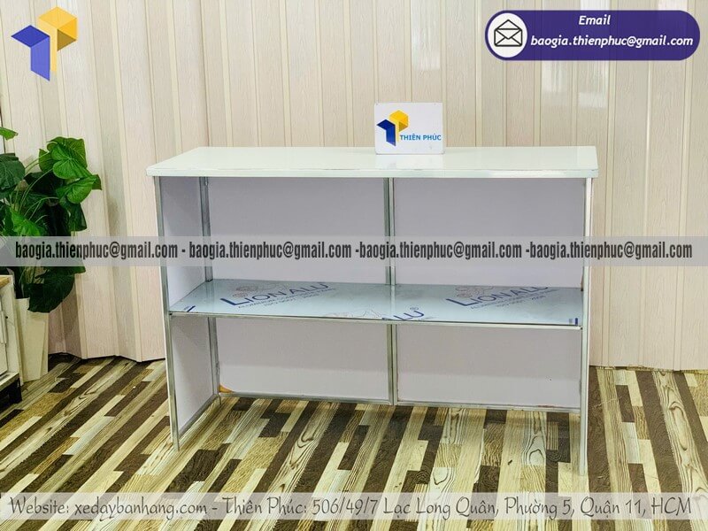 - Mặt bàn chịu lực: Đủ rộng để trưng bày sản phẩm dùng thử, máy pha cà phê mini hoặc các ấn phẩm truyền thông.