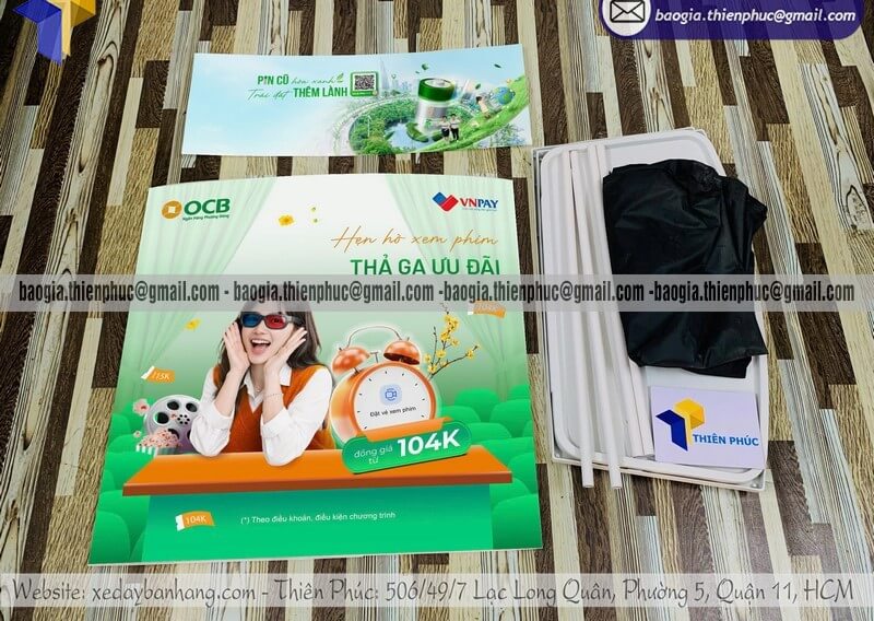 + Phần tấm logo phía trên là 0.3×0.8m chất liệu decal ngoài trời, cắt sát để cán bồi lên bề mặt bàn và tấm logo