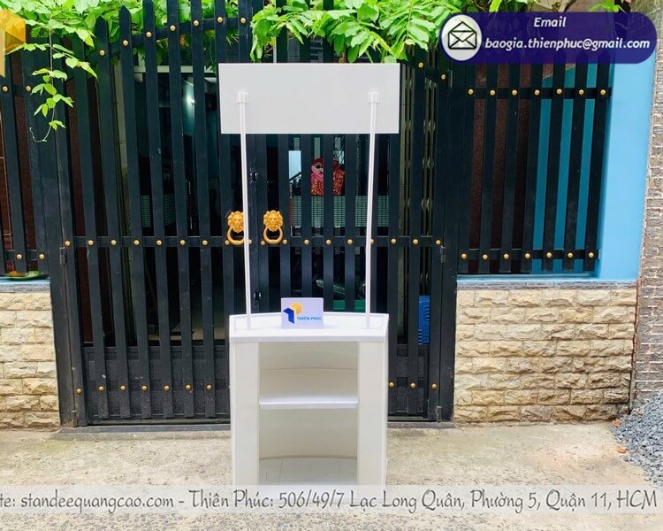 + Hai cây chống nối với logo và phần quầy bằng thép ống sơn trắng