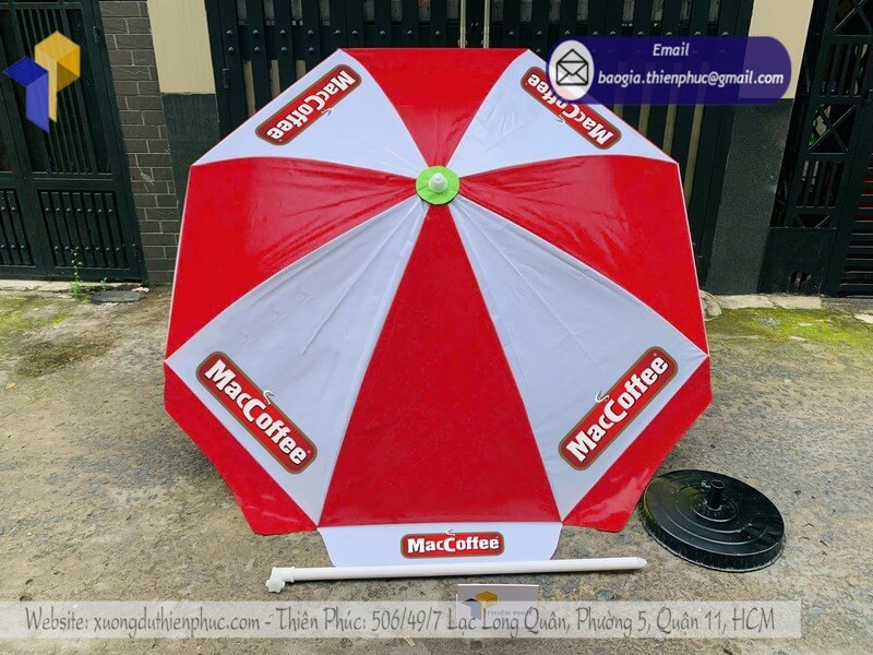 + Đóng gói: Bọc nylon từng cây dù, mỗi cây đều được phủ bột cát lên mặt dù chống dính lem màu in.