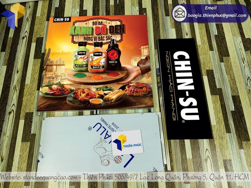 + Phần tấm logo phía trên là 0.3×0.8m chất liệu decal ngoài trời, cắt sát để cán bồi lên bề mặt bàn và tấm logo