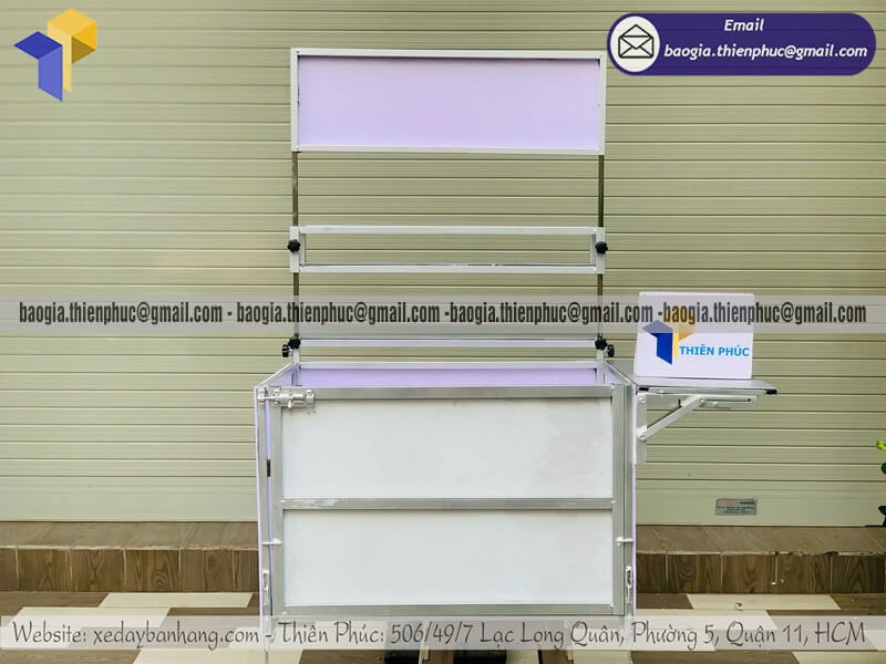 Kích thước thùng được tính toán vừa đủ để gắn sau xe máy, không gây cồng kềnh hay mất cân đối khi di chuyển. Khi dừng bán, người bán có thể mở nắp thùng, thao tác trực tiếp ngay trên xe mà không cần thêm bàn phụ.