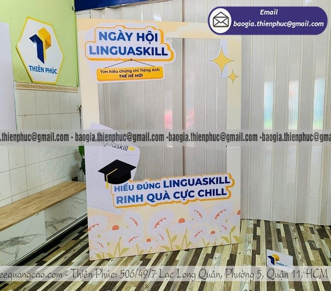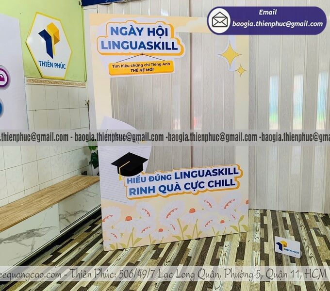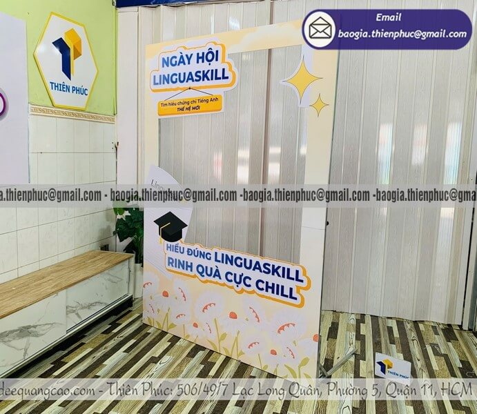 Nên đặt trước sự kiện bao lâu là hợp lý? Với mẫu đơn giản như standee hay backdrop phẳng: tối thiểu 3 ngày làm việc. Với mẫu phức tạp như khung lắp ráp 3D hay khung có đèn LED: nên đặt trước ít nhất 7–10 ngày để có thời gian duyệt thiết kế và sản xuất đúng chuẩn.