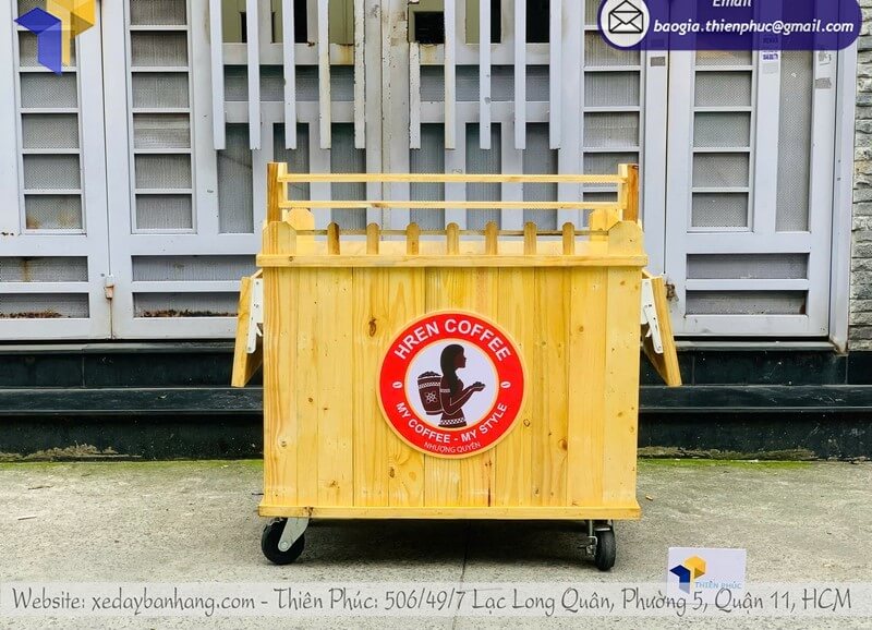Một xe gỗ bán cafe được thiết kế riêng biệt sẽ là điểm nhấn cho không gian quán hoặc sự kiện ngoài trời. Bạn có thể in logo, tên quán, hoặc các thông điệp marketing trực tiếp lên xe, giúp khách hàng nhớ đến thương hiệu của bạn lâu hơn.